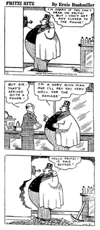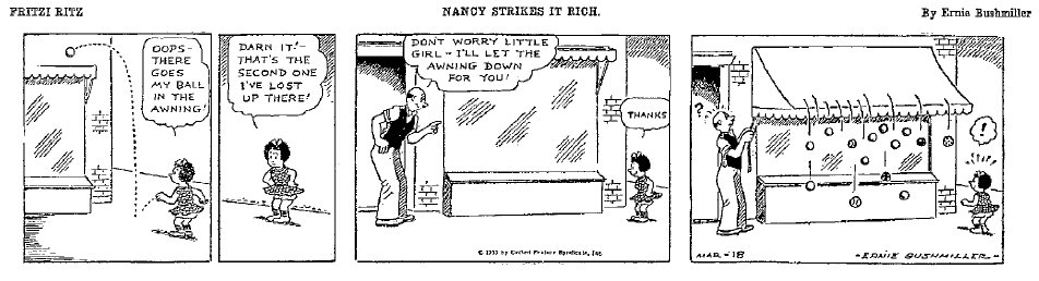 Fritzi Ritz appeared in 1922, created by Larry Whittington, and was a quick success. Bushmiller took over the strip in 1925. In 1931 the World ceased publication and Bushmiller signed a contract with United Features. Nancy originally appeared in the Fritzi Ritz strip and eased the heroine out of the title role in 1937. Nancy appeared both daily and Sundays.