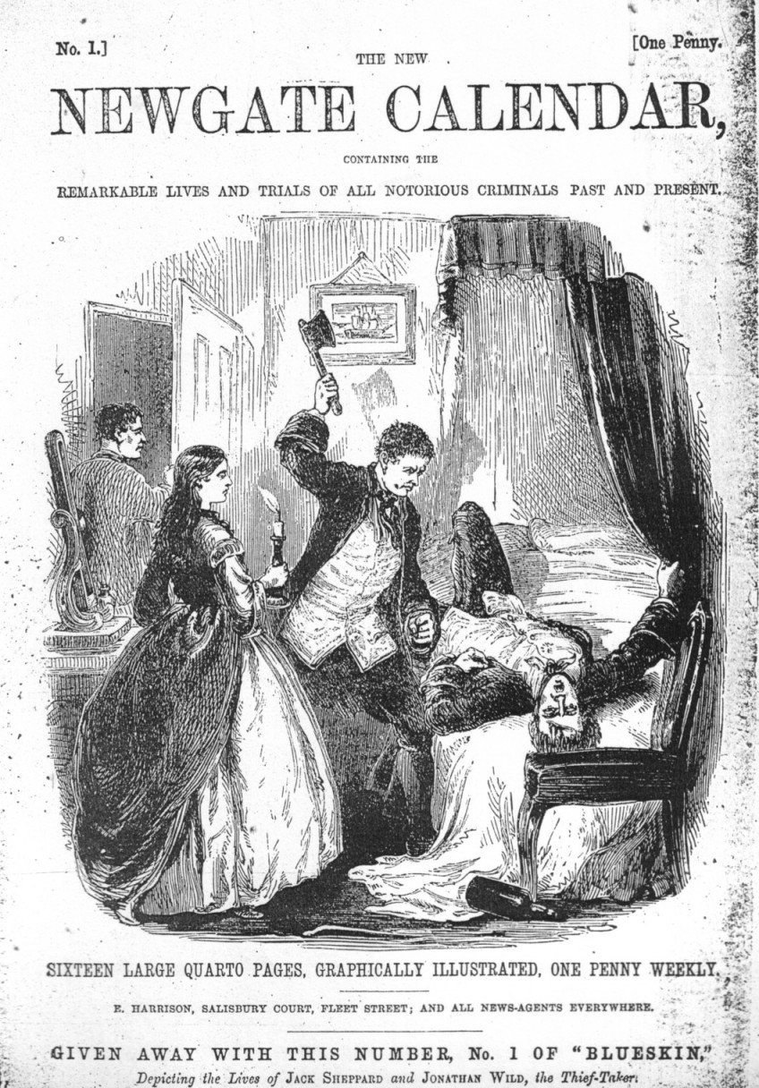 Ritchie’s New Newgate Calendar, an eight-page weekly penny dreadful of 1864, contained “Horrible Murder and Mutilation of John Hayes by his wife Catherine,” “The Diabolical Career of Mother Brownrigg, the Fetter-lane Fiend,” and “Vicissitudes of Jenny Diver, the Female MacHeath,” all dolled up in “magnificently coloured wrappers.”