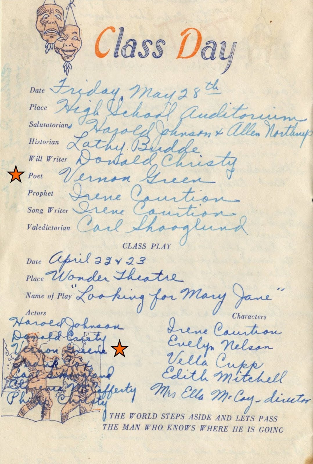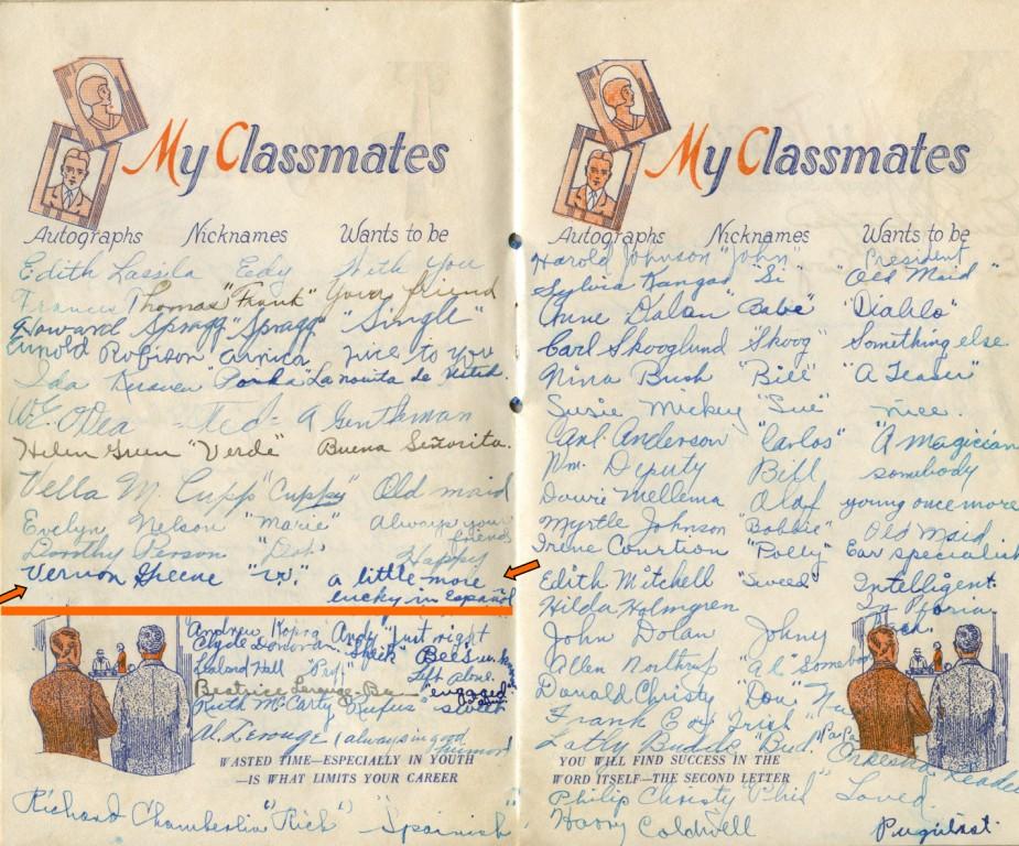 Recently Sherri purchased a little memory book of Battle Ground High School Class of 1926 (Vernon Greene’s Class). Inside there is an undated newspaper clipping (from approx. June 3rd 1929) about Vernon; who was leaving for a new position at the Toledo News Bee. You can see from the school page that his nickname was “V.V.” Greene's high school graduation was on May 27, 1926.