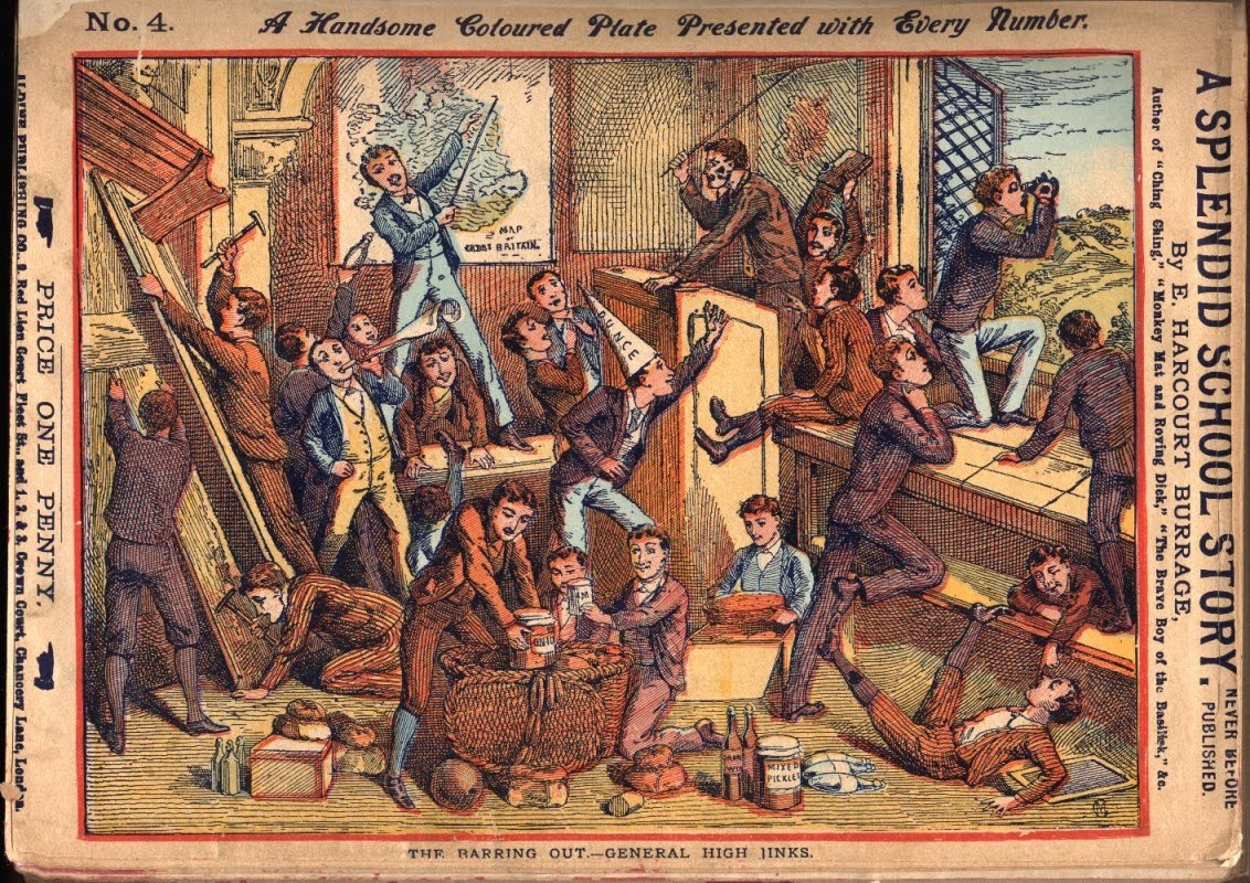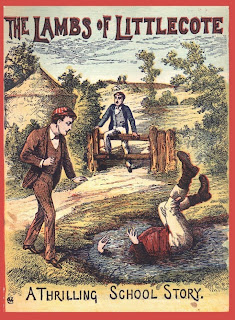 The last work by Harry Maguire that I could find was the school story The Lambs of Littlecote by his old mate E Harcourt Burrage. The Lambs of Littlecote was published by the Aldine Publishing Company in 1894, and must have been one of the last penny dreadfuls published with wood engravings. By 1895 the photo process engraving sent the woodcut the way of the dinosaur. Maguire supplied the first 13 illustrations before the job was taken over by Robert Prowse junior.