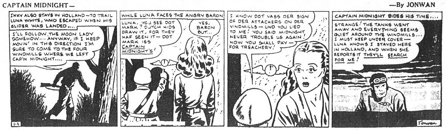 During World War II a lot of comic strip heroes fought the Axis. Captain Midnight first appeared on radio and made his debut in the comic books in Dell’s The Funnies no. 57 in July 1941 by artist Robert Brice. In 1942 Midnight changed publishers to Fawcett, home of Captain Marvel, and made his appearance in a Chicago-Sun newspaper strip signed Jonwan. Two more strips from 1942 were Race Riley and the Commandos by Milburn Rosser and Captain Yank by Frank Tinsley which originally ran under the title Yankee Doodle. In these samples from 1943 Lt. Dick Calkins Buck Rogers took on the Shintos, a super race whose uniforms were decorated with a backwards swastika. Don Winslow of the Navy was by Frank V. Martinek and the comic book was also produced for Fawcett comics. Russell Keaton’s Flyin’Jenny also had a Fawcett connection in the person of artist Marc Swayze, who pens a regular column for Alter Ego called “We Didn’t Know it was the Golden Age.” Last we have the marine Stony Craig by Frank H. Rentfrow and artist Bouchard.