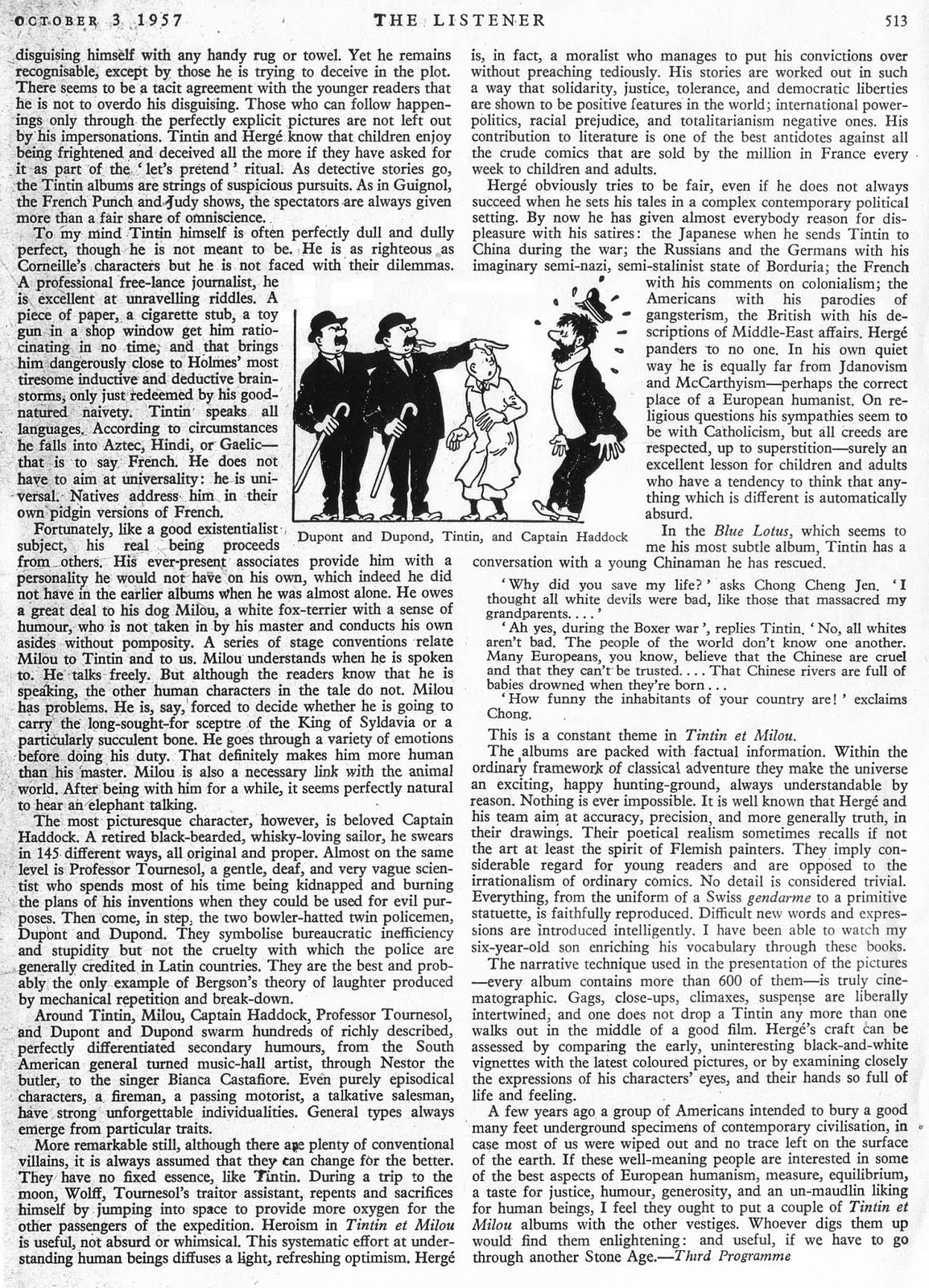 ‘Tintin, Milou, and European Humanism’ was written 3 October 1957 for The Listener, and is a welcome counterpoint to scurrilous attacks on Hergé on the internet and in print. Tintin and Asterix the Gaul were in trouble in England as early as October 1983, when librarians received complaints of racism and sexism in both titles. Tintin was considered the worst offender. This brought forth a letter to the Times which said “Mr. Dunn admits that the children who frequent the library would be sorry to see the books banned: on the available evidence, so would anyone with any sense or sense of humour.”