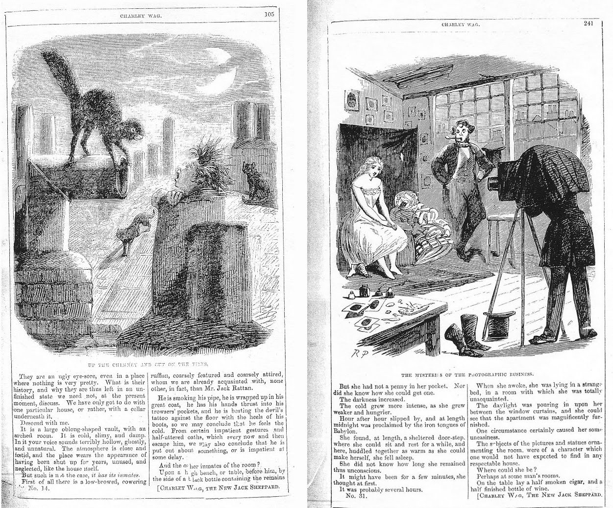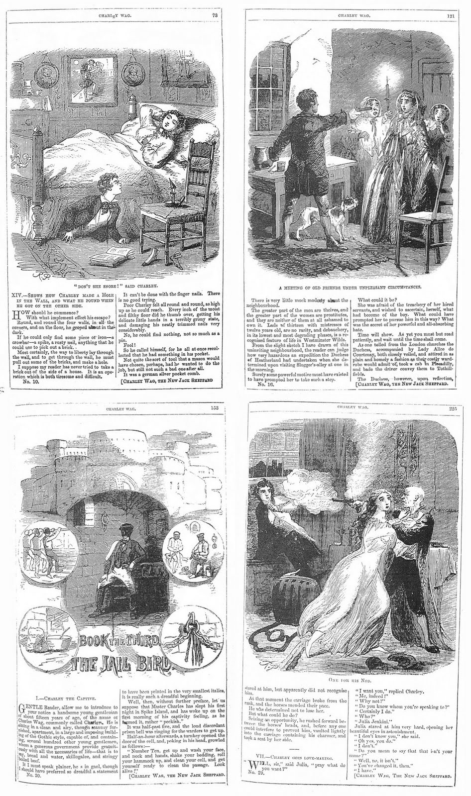These two illustrations below were sent to me by comic strip historian Bill Blackbeard from his personal copy along with the publisher’s data: Charley Wag, the New Jack Sheppard, by the author of “The Woman with the Yellow Hair,” “Somebody Else’s Wife,” &c. London: George Vickers, Angel Court, Strand, 577 pp., 72 parts.