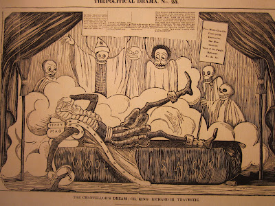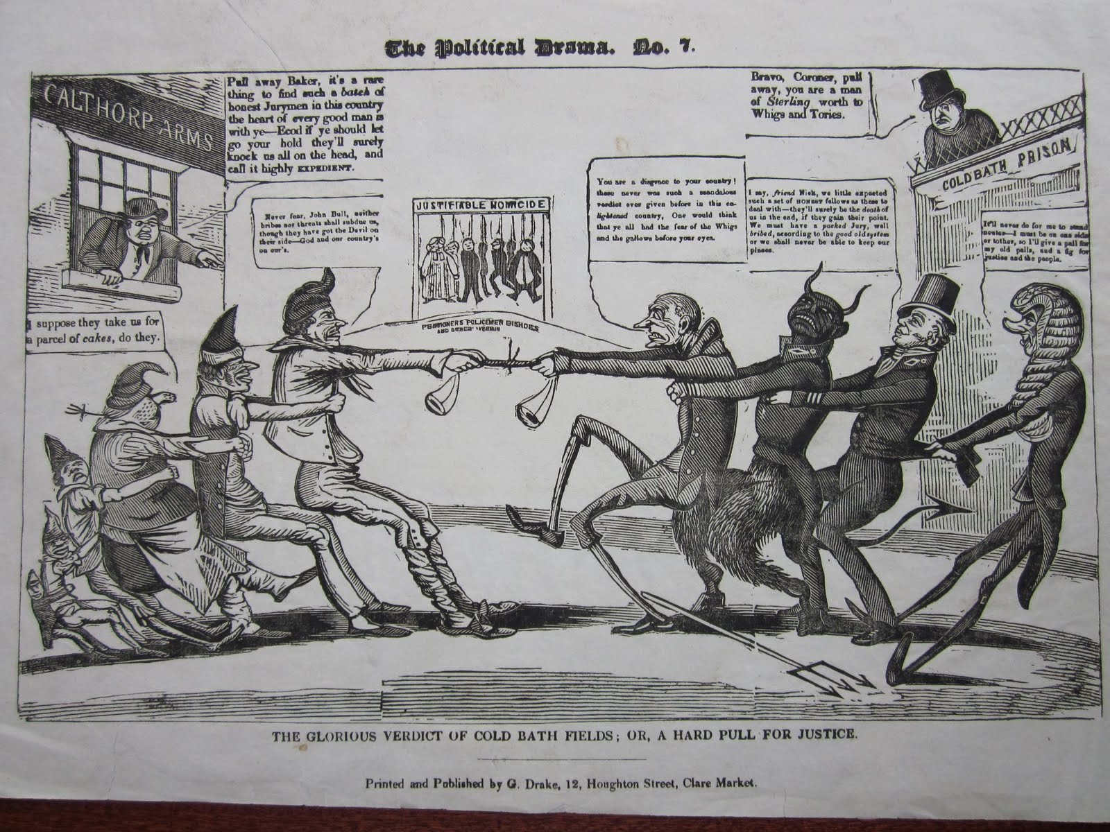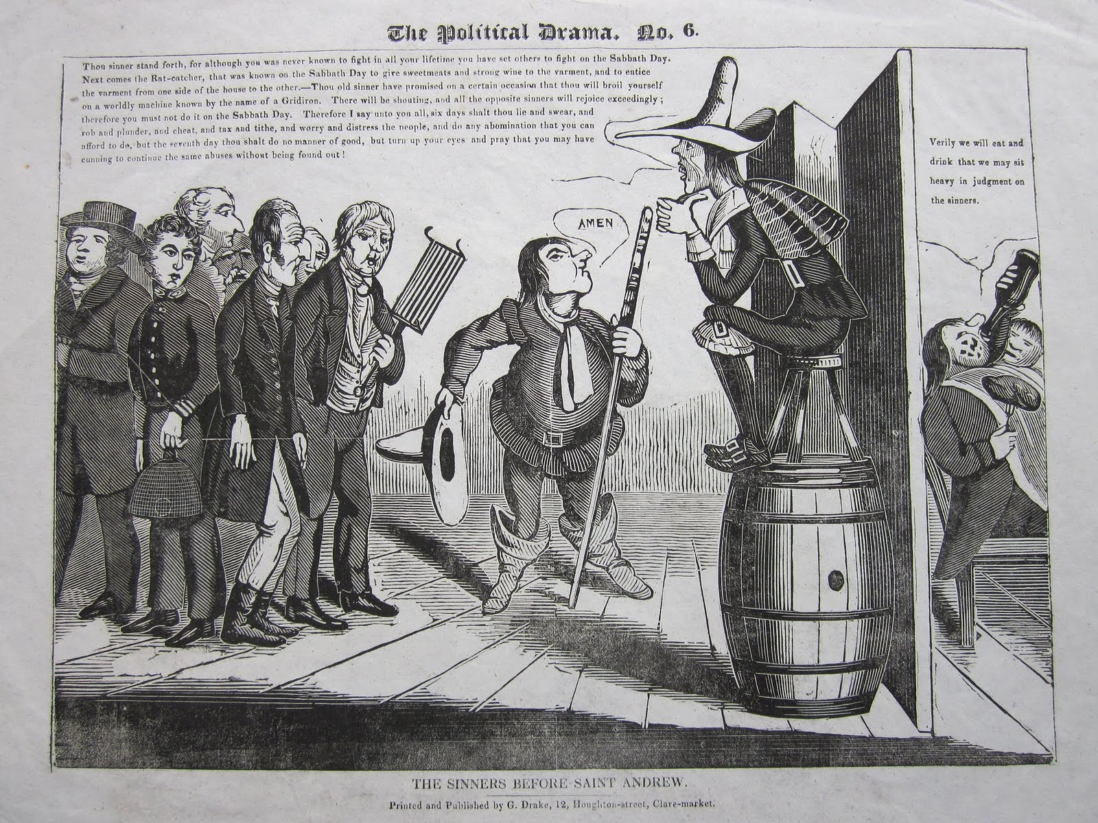 The Political Drama series typifies Grant's work in this period. The world of late Hanoverian Britain portrayed in the Political Drama is almost unremittingly confrontational and at times, I feel, Grant displays the same sense of even-handed misanthropy that we would normally associate with Gillray’s works. Authority figures are relentlessly attacked: magistrates are corrupt, policemen are murderous drunkards, politicians are debased, the King is portrayed as a childlike idiot and the clergy are hypocritical gluttons. Throughout the series these various figures conspire to deny the poor even the most basic of political rights and even the rudimentary pleasures of life such as a alcohol and tobacco.