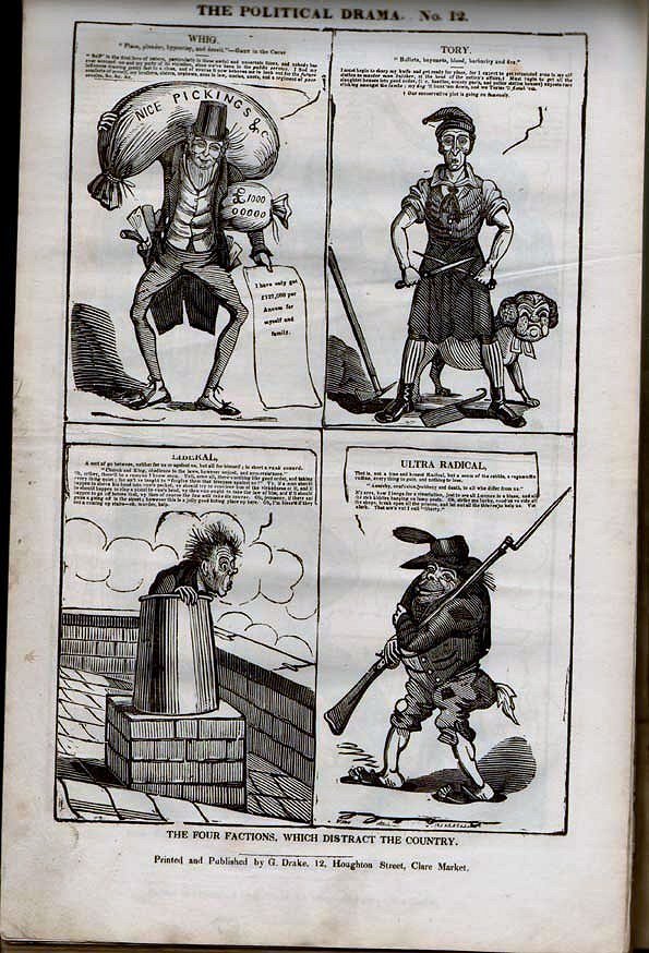 *Editor’s note: George Drake was a prolific publisher of penny works at the time Grant was drawing the ‘Political Drama.’ Most of his titles at this time were edited and probably written by young comic songwriter Thomas Prest, future author of the penny blood ‘Ela the Outcast; or, the Gipsy of Rosemary Dell.’ Some of these titles may have been illustrated by C. J. Grant. The text and illustrations for this post are courtesy of Mathew Crowther. For more particulars on the life of C. J. Grant see my previous post, The English Comic Strip. (J.A.)