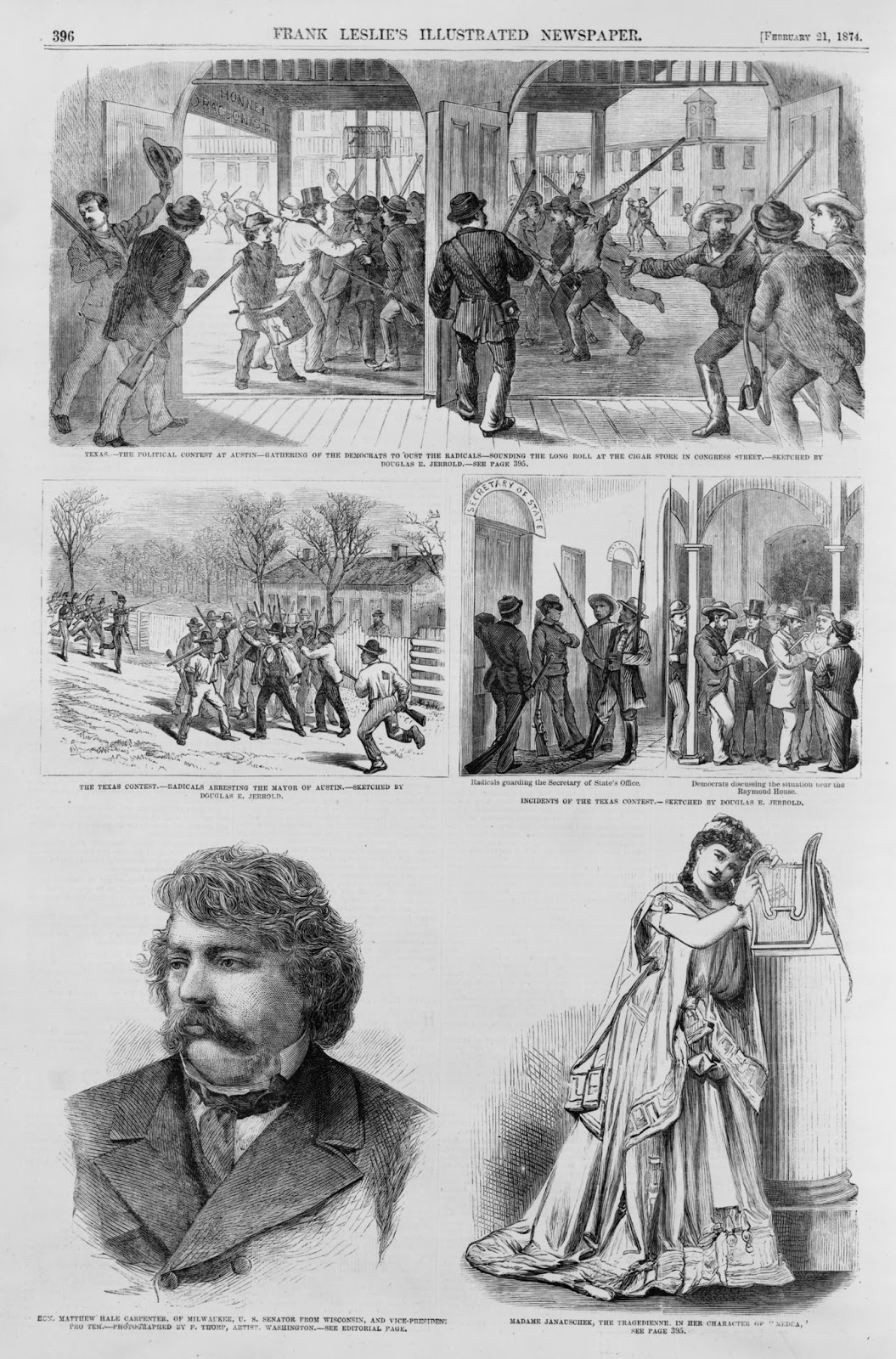 In February 1874 he was in Austin, Texas (as stated by Gaines Kincaide), where he produced a series of drawings illustrating the contest between the Republicans and Democrats, published in