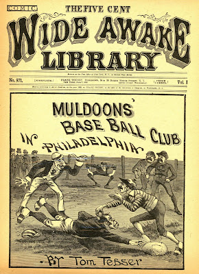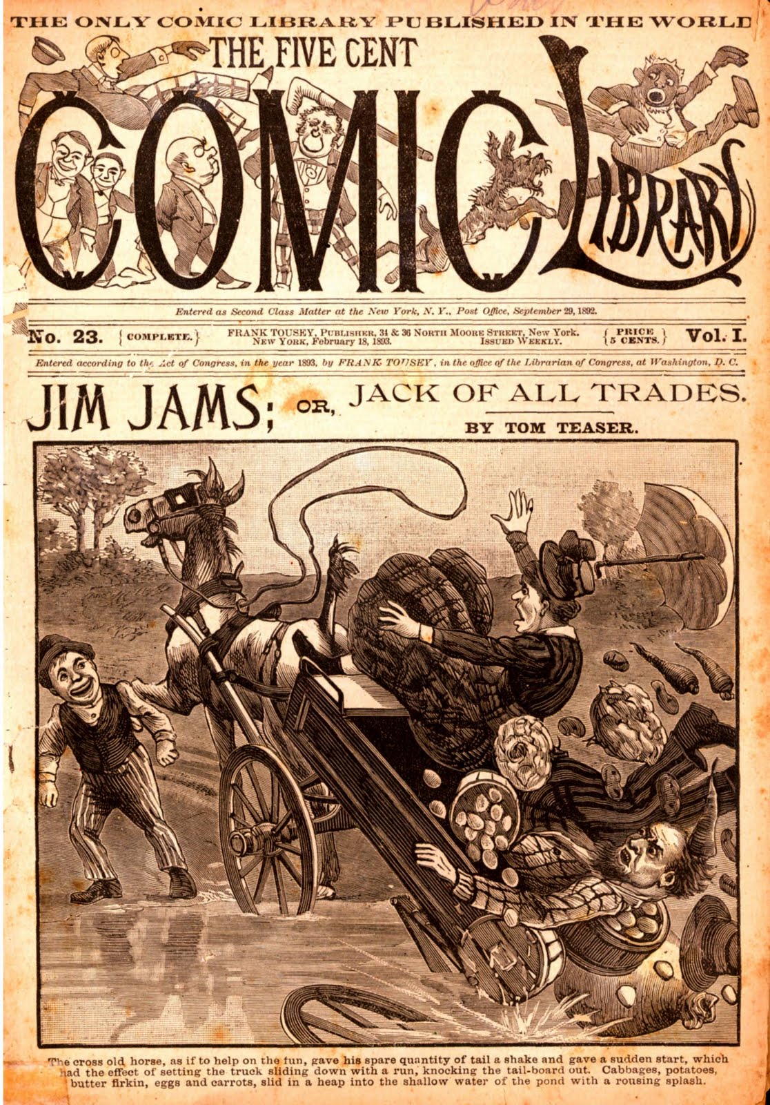 Although many of Tousey’s “comics” originated in his large format story papers, they circulated longest in “The Great 5 Cent Wide Awake Library” from 1878 to 1898, which ran 1,353 issues, plus 43 issues of the “Wide Awake Library – Special Numbers” at ten cents for twice as much content. On January 12, 1898, a week after the final issue of Wide Awake Library, Tousey began Pluck and Luck: Complete Stories of Adventure,” mostly reprints of the earlier series, but with full color covers. This nickel weekly ran until 1929, for 1,605 issues. Popular genres and subseries rated their own weeklies, including the techno-fictional Frank Reade, Jr. stories, and the “comics” in Snaps. A Comic Weekly of Comic Stories by Comic Authors. “Tom Teaser’s” stories of the Muldoon clan and other hapless buffoons dominated the “Wide Awake Library – Special Numbers” and featured in the black-and-white Five Cent Comic Library and the color cover Snaps. Besides Muldoon, Ten Eyck also created “Alderman Sweeney,” “The Jolly Moke,” “Our Camping Out Club,” “Ikey” "Cholly and Gussie" and other comic characters.