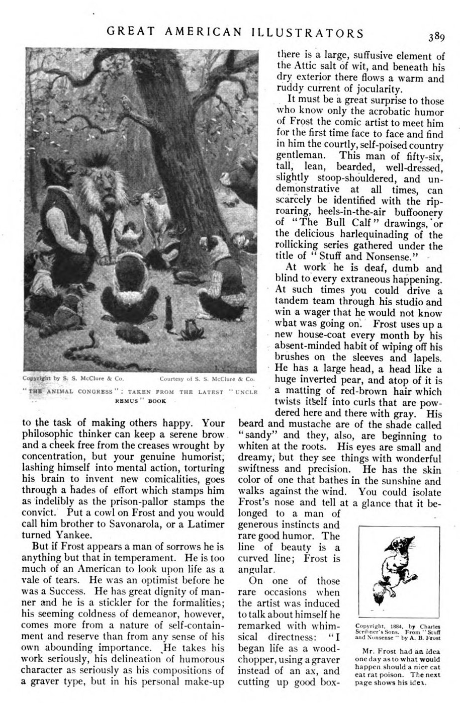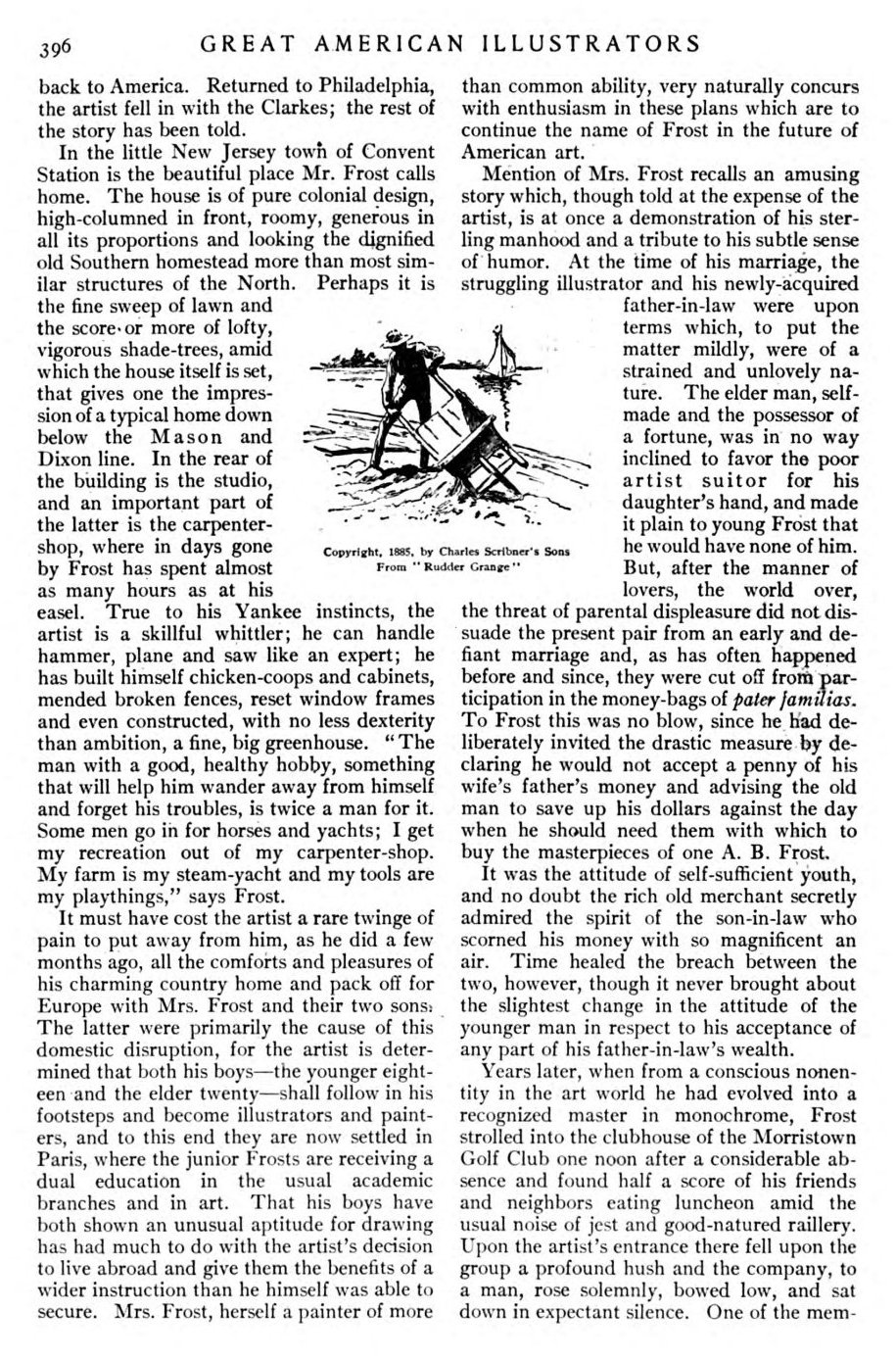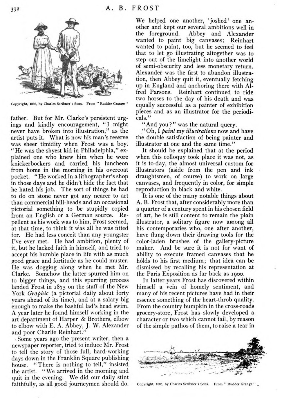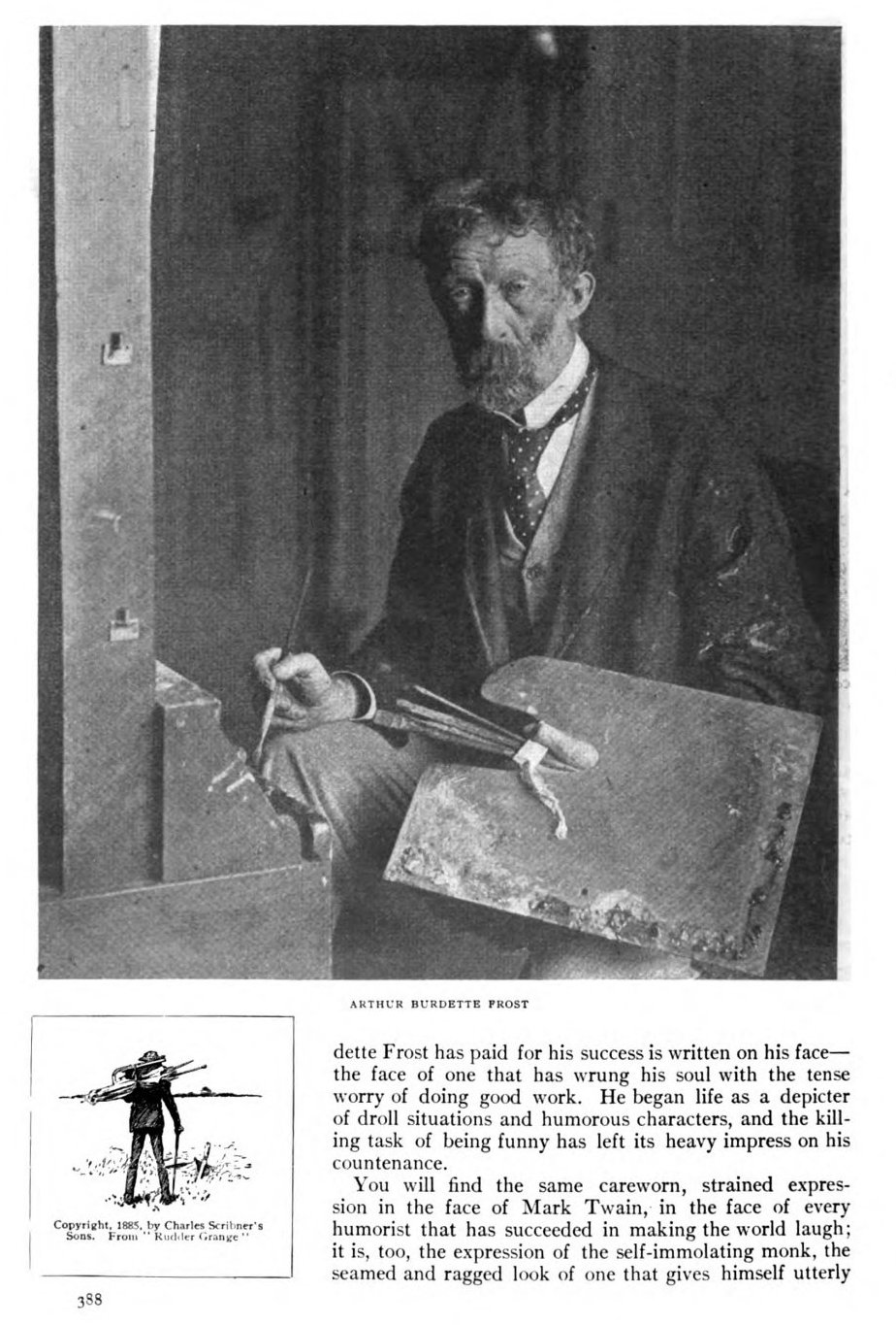 YOUNG A.B. FROST got his start in Philadelphia at fifteen years of age, employed by an engraver. He then studied and worked as a lithographer (a bad one according to himself) for the next five years. He started his career as an illustrator when his friend William J. Clarke introduced him to his brother, the humorist Charles Heber Clarke, who wrote under the name “Max Adeler” and employed Frost to illustrate Out of the Hurly-Burly (1874). The book was a smashing success. Still, Henry Cuyler Bunner in an article titled ‘A.B. Frost’ in Harper’s Magazine for October 1892, wrote of the illustrations