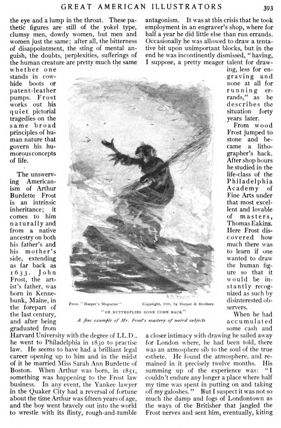 It is hard to see in those coarse woodcuts, that look as if they were carved with a penknife, the touch of Mr. Frost’s firm and facile hand. Those who know his work today must find it difficult to realize that these rough productions represented a positive superiority to the efforts of other young men of his day and generation; yet they did, and the fact was immediately recognized. But as we look at those cuts today, it seems as if that engraver could have killed any genius that ever lived.