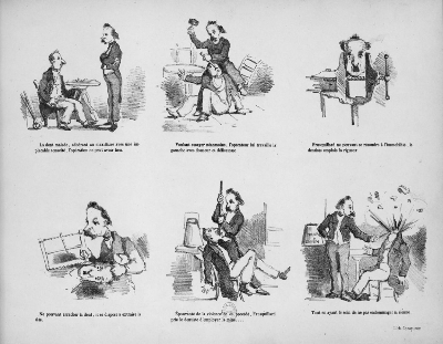 4 [1861] Brain blast. A frustrated dentist resorts to blowing up his patient’s head. Édouard Chevret, in page 14 of his 38-page French comic strip novel ‘La Perroquettomanie,’ self-published.